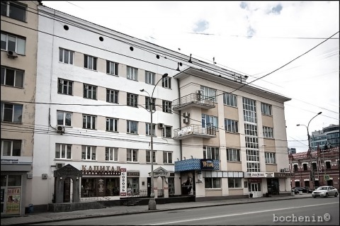 Малышева ул., 24. Дом СВЕРДЛКОГИЗа. Здание состоит из двух объемов - углового четырехэтажного спроектированного как административное здание, и более протяженного пятиэтажного, где располагались квартиры. Уличный фасад украшают круглые слуховые окна. Угловой ризалит оформлен балконами с корабельными перилами.